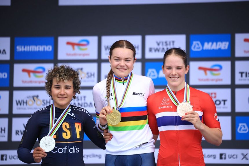 Umuholandikazi Megan Arens na mugenzi we Michiel Mouris ni bo begukanye imidali ya zahabu muri Shampiyona y’Isi y’Amagare mu cyiciro cy’abangavu n’ingimbi batarengeje imyaka 19, aho basiganwaga n’ibihe ku giti cyabo, ‘Junior Individual Time Trial’.