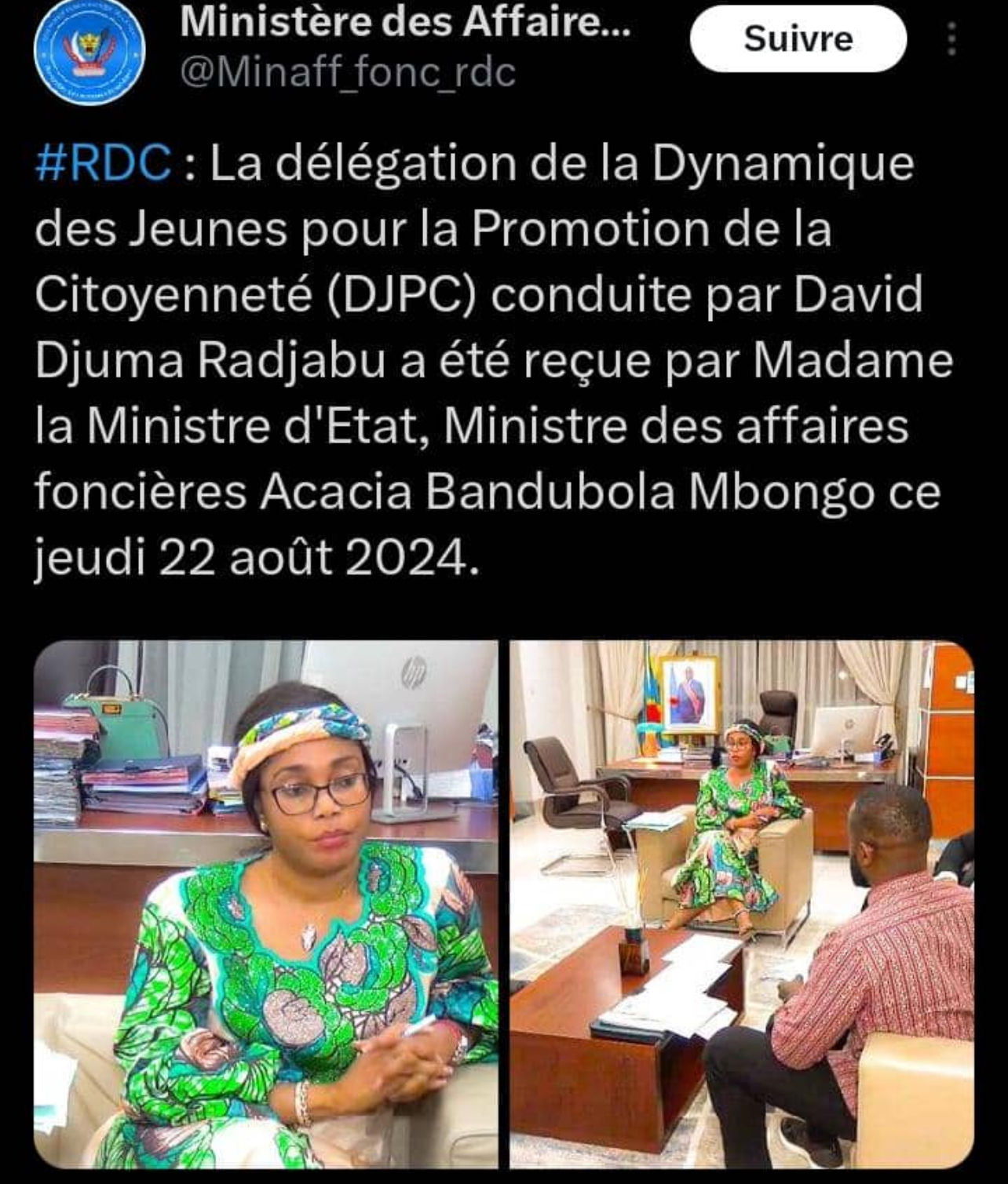 Beyond his inflammatory speeches, Djuma has direct links to Kinshasa’s ruling establishment. On August 22, 2024, he was officially received by the Minister of Land Affairs in Kinshasa, a meeting that was even publicly acknowledged in a government tweet. His close association with Tshisekedi’s inner circle raises serious questions about the Congolese government’s role in orchestrating the attack.