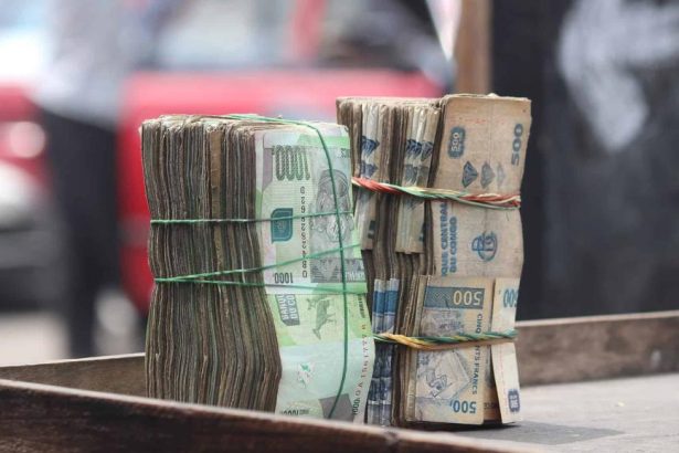 On a warm morning at the Goma no man’s land, money changers pile old…