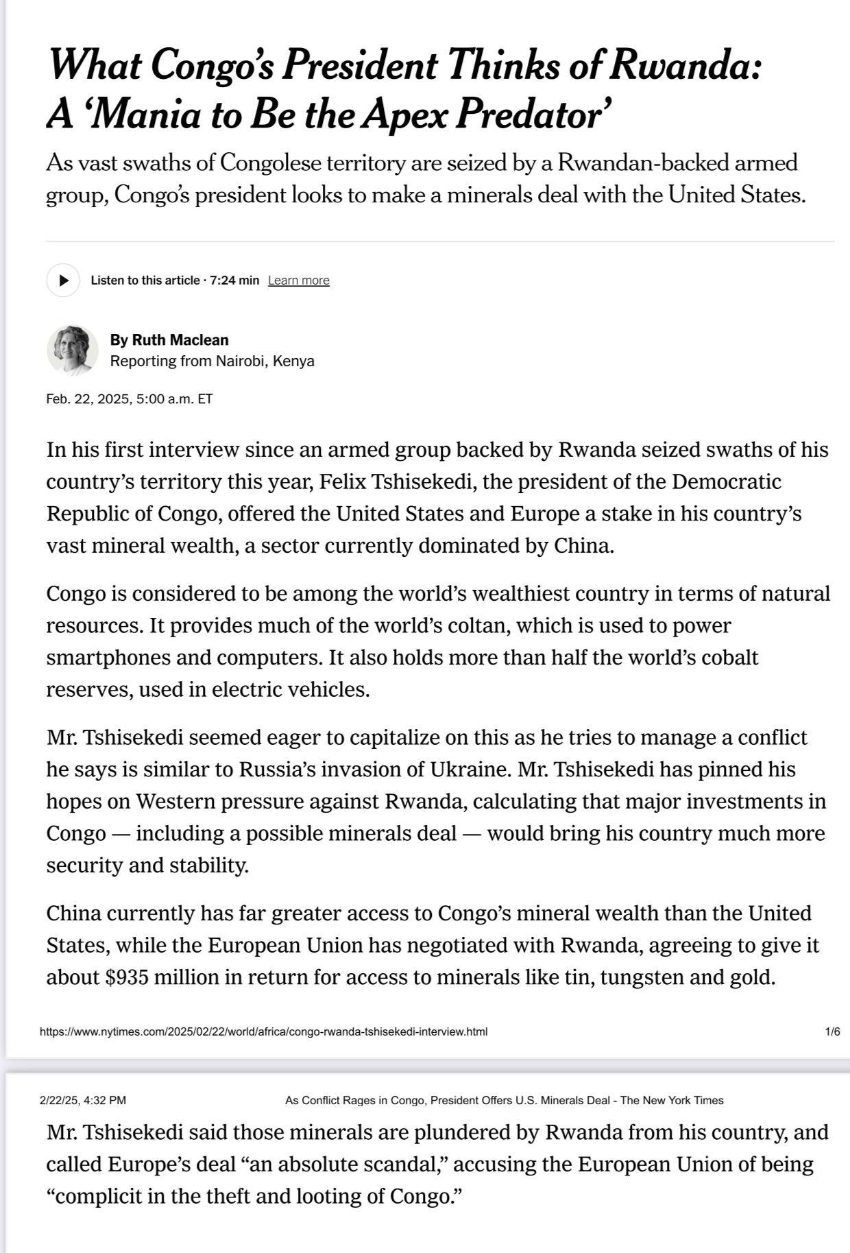 There’s an old Congolese proverb: “A chief who cannot protect his village will sell its land instead.” Félix Tshisekedi seems to have taken this wisdom to heart, not as a warning, but as a strategy. While M23 fighters march toward Butembo and the Congolese army collapses in disarray, Tshisekedi sits in Kinshasa offering America and Europe a stake in Congo’s minerals. The New York Times put it bluntly: “Mr. Tshisekedi seemed eager to capitalize on this as he tries to manage a conflict he says is similar to Russia’s invasion of Ukraine.”