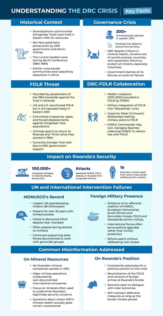 Rwanda’s Minister of Defense, General James Kabarebe, explained his country’s perspective: “No nation would accept genocidal forces operating freely on its border. The international community expects Rwanda to forget its history and ignore clear threats. Would France tolerate Nazi remnants organizing on its border? Would the United States?”